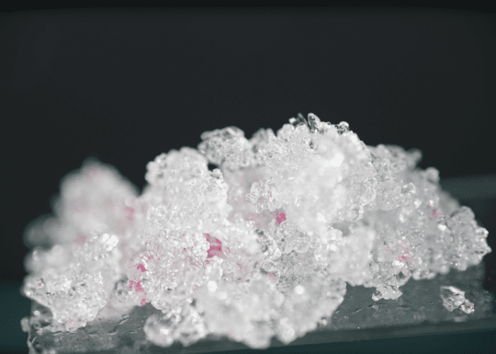 Close-up of crystalline ice with pink reflections on a dark background.
