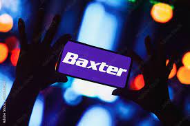 Hands holding a phone displaying the Baxter logo against a blurred background.